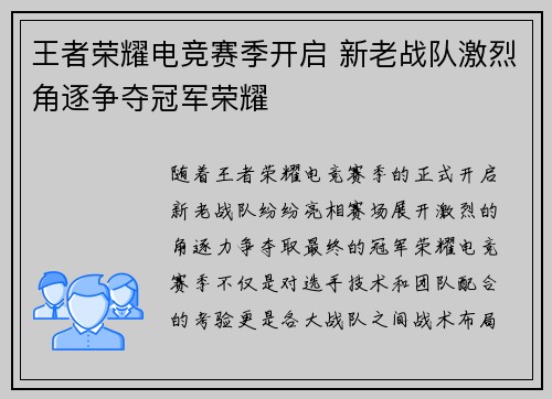 随着王者荣耀电竞赛季的正式开启,新老战队纷纷亮相赛场,展开激烈的角逐,力争夺取最终的冠军荣耀。电竞赛季不仅是对选手技术和团队配合的考验,更是各大战队之间战术布局和心理博弈的较量。新兴战队凭借年轻的力量和创新的打法,挑战传统强队的统治地位,而老牌战队则通过经验和稳定性,力图保持对冠军的掌控。每一场比赛都充满了悬念和看点,观众们不仅关注比赛本身,更加期待新老战队之间精彩的对抗和历史的传承。本文将从战队动态、选手表现、战术策略和赛事意义四个方面,详细阐述王者荣耀电竞赛季的开幕,以及新老战队激烈角逐的精彩场面。