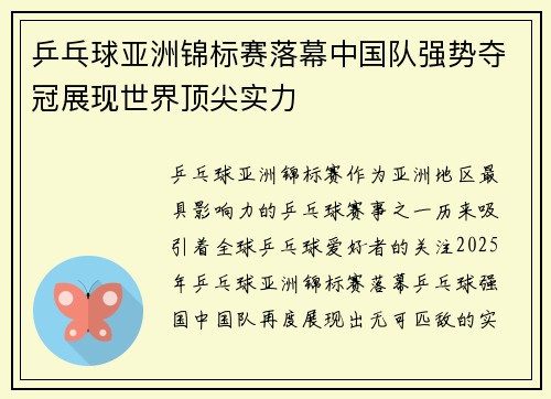 title>乒乓球亚洲锦标赛落幕中国队强势夺冠展现世界顶尖实力 - 星空体育(China)官方网站 STARRYSKY SPORTS