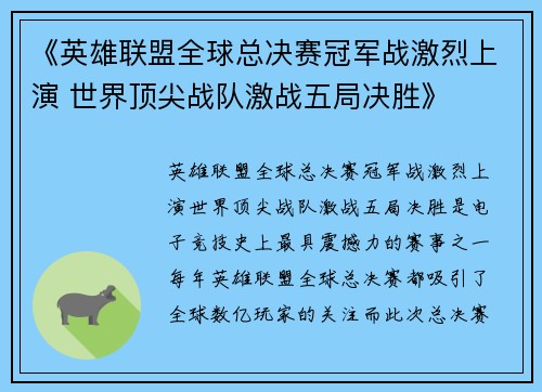 title>《英雄联盟全球总决赛冠军战激烈上演 世界顶尖战队激战五局决胜》 - 星空体育(China)官方网站 STARRYSKY SPORTS
