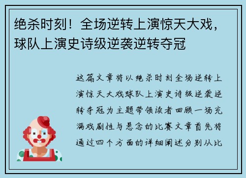 这篇文章将以“绝杀时刻!全场逆转上演惊天大戏,球队上演史诗级逆袭逆转夺冠”为主题,带领读者回顾一场充满戏剧性与悬念的比赛。文章首先将通过四个方面的详细阐述,分别从比赛中的关键时刻、球队战术的调整、球员的个人英雄主义表现和观众的情感共鸣等角度,全面呈现这场充满反转的比赛全貌。接下来将逐一分析这些方面,探讨如何在看似绝望的局势中,球队依靠智慧、努力与坚持实现了史诗级的逆袭与夺冠。最后,文章会结合整个故事的高潮部分,做出深入的总结与反思,力求让读者在感官上体验到比赛的紧张与刺激,同时在思想上也能有所收获。
